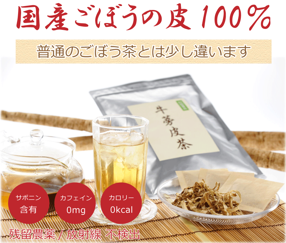 一般的なごぼう茶の原材料は、「可食部使用」「丸ごと使用」「皮ごと使用」などですが、弊社のごぼう皮茶はその名のとおりごぼうの皮100%です。