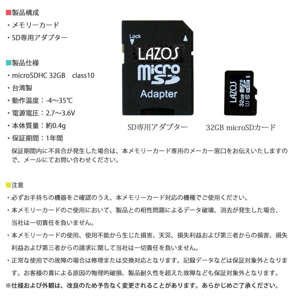 ■製品構成 ・メモリーカード ・SD専用アダプター ■製品仕様 ・micro SD HC 32GB class10 ・台湾製 ・動作温度:−4〜35℃ ・電源電圧:2.7〜3.6V ・本体質量:約0.4g ・保証期間:1年間 保証期間内に不具合が発生した場合は、本メモリーカード専用のメーカー窓口をお伝えいたしますので、メールにてお問い合わせください。