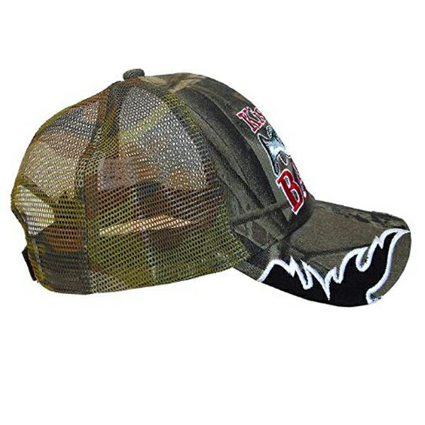 【商品詳細】 フロントに「Kiss My BASS」の文字と「バス」イラストのが立体的な刺繍で配置されているデザイン! フロントからツバかけては、「モッシーオーク柄」の生地が使われていて、ツバには、ブラックカラーの「フレイム」デザインの刺繍が施されています! サイドからバックにかけてはメッシュ生地が使われていて、通気性抜群! バックは、マジックテープ式のアジャスターになっていて、サイズ調整可能です。